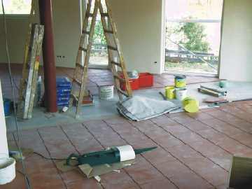 Auch ein Grund, weshalb wir die Treppe gut verpacken. Oberhalb des ersten Podestes muß dieser Absatz noch verputzt werden, zuvor zudem die Elektroleitung verzogen werden (Stemmarbeiten), danach wird der Absatz mit Cotto abgedeckt. |