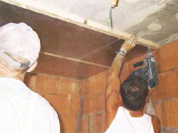 Gedämmt wird mit Linitherm PAL Sil Dämmplatten aus Polyuretan 025. Um die vorgeschriebenen Dämmwerte zu erzielen wird mit dem besten Dämmmaterial gearbeitet. Zuerst werden Rahmenschenkel aus Fichtenholz an die Betondecke gedübelt. Zwischen die Rahmenschenkel (4*4 cm) werden alukaschierte PU Platten geklemmt. Auf die Rahmenschenkel werden dann versetzt 15 cm dicke PU Platten mit Silikatoberfläche geschraubt.