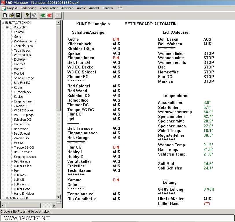 Nachdem nun unser Solarkollektor funktionsfähig ist und bei Sonnenschein solare Gewinne erzielt werden können, wurde der Heizstab im Homemanager programmiert. Dachfolgend sichtbar ist die Grundanzeige der Möller Homemanagersoftware (F&G Manager Version 3.3 mit unserer ETS).