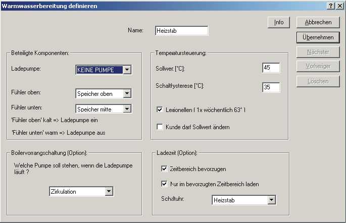 Der Schaltfunktion werden weitere Parameter zugeordnet (Abschaltung des Heizstabes bei 45 Grad Speichertemperatur, zusätzliches Legionellenprogramm, Abschalten der Trinkwasserzirkulation während der Heizzeit)