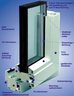 Den Fenstern kommt im Passivhaus eine herausragende Bedeutung zu, da in der Regel etwa 37% der Raumwärme über die Fenster wieder abfließt. Wärmeverluste verringern und passive solare Gewinne optimieren - ohne "supergedämmte" Fenster mit höchsten Ansprüchen an Glas und Fensterrahmen ist dieses Ziel nicht realisierbar. Innovative Fensterkonstruktionen mit speziellen Dreischeiben-Wärmeschutzverglasungen und gedämmten Fensterrahmen lassen die Wärme in den Räumen, so dass auch ohne Standard-Heizungsanlage ausreichender Komfort garantiert ist.