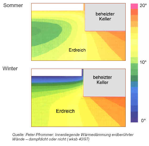 Beheizte Keller unterliegen der Wärmeschutz- bzw. in Zukunft der Energieeinsparverordnung. Der Nachweis des baulichen Wärmeschutzes nach dem Energiebilanzverfahren schreibt zwar keinen k-Wert (in Zukunft U-Wert) für Kellerwände vor. Er sollte dennoch nicht zu niedrig sein, weil warme Wände und Decken vor Tauwasserniederschlag schützen. Da im Sommer die Wärmezufuhr in die Kellerräume (Heizung abgestellt oder nur auf Warmwasserbetrieb) und die Wärmeabgabe moderner Heizungen sehr gering ist, sollte die Wärmedämmung von Kellersohle und -wänden nicht ungünstiger als 0,5 W/m²K sein. Um Tauwasserniederschlag auf den Oberflächen vorzubeugen, ist auch bei unbeheizten Kellern ein Mindestwärmeschutz zu empfehlen.