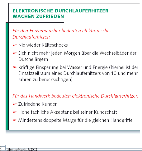 Zuverlässig gesteuert Der integrierte Mikroprozessor des VED E classic ermittelt und steuert anhand der Wassereinlauftemperaturund der per Flügelradsensor erfassten Wassermenge die erforderliche Temperaturleistung des Gerätes auf der Basis der gewählten Temperatureinstellung. Die Temperatur lässt sich per Drehschalter leicht auf einen Wert stufenlos zwischen 30 und 60 °C einstellen. Der Temperaturbereich entspricht einer Skala von 1 bis 7 am Gerät. VED-E 21/5 €550,- (Netto)