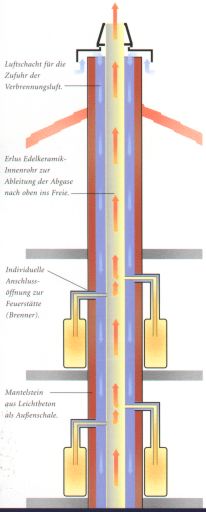 dass kein unzulässig hoher Unterdruck entsteht. Eine weitere Möglichkeit ist es, die Festbrennstoff-Feuerstätte (Kamin- oder Kachelofen etc.) mit einem Luft-Abgas-Schornstein zu betreiben. Er ermöglicht den raumluftunabhängigen Betrieb, indem er die notwendige Verbrennungsluft über einen eigenen, an den Mantelstein angeformten Lüftungszug zur Verfügung stellt. Dabei ist eine Konstellation aus Festbrennstoffzug, Lüftungszug und Zentralheizungszug (zum Anschluss einer raumluftabhängig oder raumluftunabhängig arbeitenden Heizungsanlage) sinnvoll. |