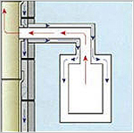 Lösungsansatz – Luftkanal nach außen Über einen separaten Luftkanal nach außen wird die Verbrennungsluft zugeführt. Nachteile:Die thermische Hülle des Hauses wird durchbrochen und umfangreiche bauliche Maßnahmen sind notwendig. Ein Schutz gegen Ungeziefer ist vorzusehen. |