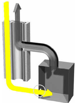 | Die Verbrennungsluft wird der Feuerstätte entgegen dem Abgasstrom zugeführt und dabei im Sinne eines effizienten Verbrennungsvorganges vorgewärmt. |