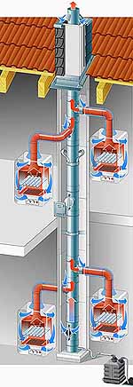 Für das dezentrale Heizen sind LA-Systeme die sicherste Lösung. Sie ermöglichen den Betrieb der Feuerstätte, ohne die Verbrennungsluft dem Aufstellraum zu entziehen. Probleme mit offenen Feuerstätten, Dunstabzugshauben oder dichten Fenstern gibt es nicht mehr. Die Montage ist in Ein- und Mehrfamilienhäusern zugelassen. Es können pro Etage vier