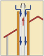 Lösungsansatz Wienerberger Über den Schornsteinschacht wird Verbrennungsluft der Feuerstätte konzentrisch zugeführt.1 Vorteile: Ein schlanker Schornstein und eine unkomplizierte Konstruktion. 1 Durch Teilwärmedämmung wird bei der konzentrischen Lösung ein thermischer Auftrieb der Zuluft vermieden. |