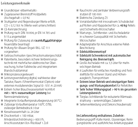 Thermostatische Regelung Zündung und Regelung mit Fernbedienung Wärmeleistung über 5 Stufen regelbar Geringer Ascheanfall (<0,5%) Raumluftunabhängig Heizleistung ca. 2,5 - 7 kW