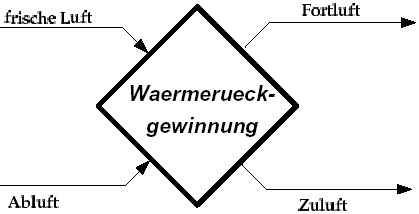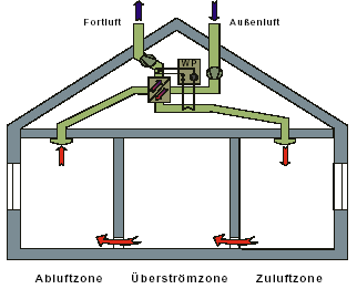 Um die hygienischen Anforderungen an die Raumluftqualität dennoch einzuhalten, muss der Raum manuell oder mechanisch "kontrolliert" belüftet werden. Vom Standard eines Niedrigenergiegebäudes an wird für das energetische Konzept eine kontrollierte Wohnungslüftung mit einer Wärmerückgewinnung aus der Abluft notwendig. Das nachfolgende Bild zeigt das Schema einer mechanischen Zu- und Abluftanlage mit Wärmerückgewinnung, wie sie für Niedrigstenergie- und Passivhäuser erforderlich ist.