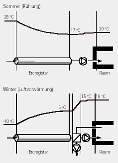 der Lüftungsanlage zugeführt. Das Erdreich dient dabei als Speichermasse, die sowohl