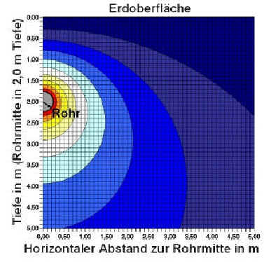 | Die Erdreichtemperatur an der Rohrwand hängt zunächst vom Wärmeaustausch zwischen dem tiefen Erdreich, den oberflächennahen Erdschichten und der Umgebungsluft ab. Sobald der EWT in Betrieb ist, beeinflusst der Wärmeaustausch zwischen Luft und Rohr im EWT ebenso die Erdreichtemperatur an der Rohrwand und in der Nähe des Rohres. Die ungestörte Erdreichtemperatur an der Rohrwand sei die Temperatur, die das Erdreich ohne EWT an einer beliebigen Stelle annehmen würde. Dies entspricht bei homogenem Erdreich der Temperatur, die das Erdreich in gleicher Tiefe aber weitab vom EWT einnimmt. | Beeinflussung des