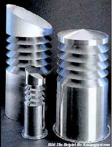 Die VHL Lamellenhaube ist eine Außen- und Fortlufthaube. Sie zeichnet sich durch ein besonderes architektonisches Design aus.n Die Haube ist standardmäßig in verzinktem Blech, aber auch mit schwarzer Pulverbeschichtung lieferbar. Um einen harmonischen Übergang vom Rohr zur Haube zu erhalten, kann man als Anschluß an die Haube ein Rohr mit dem Durchmesser .D wählen. Unterm Dach kann dann eventuell auf .d reduziert werden (siehe Montagebeispiel 1). Die Hauben können auch direkt auf ein Rohr mit .d montiert werden (siehe Montagebeispiel 2). Die Hauben müssen grundsätzlich für den Nenn-Durchmesser .d1 ausgelegt werden.