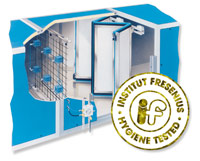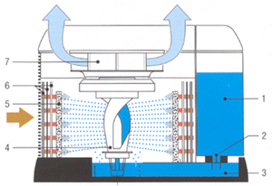 Funktionsprinzip Adiabates Luftbefeuchtungssystem mit Fresenius-Hygienezertifikat für die Zuluft-Befeuchtung in Klimaanlagen. Das Befeuchtungswasser wird mittels Niederdruck-Molekularzertäubungs-Düsen zunächst in feine Aerosole zerstäubt und verdunstet. Die verbleibenden Aerosole werden anschließend von porösen Keramikelementen aufgefangen und nachverdunstet. Durch die Verbindung der Befeuchtungstechniken Zerstäuben und Verdunsten werden hohe Befeuchtungsleistungen bei niedrigem Energieverbrauch und geringsten Spülwassermengen erreicht. |