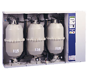 Einstoff-Luftbefeuchtungssystem Das Colt Cumulus-Luftbefeuchtungssystem gibt es in zwei technischen Varianten: als sogenannte Einstoff- bzw. Zweistoff-Luftbefeuchtungseinheit. Das Einstoff-Luftbefeuchtungssystem arbeitet auf der Basis einer Hochdruck-Kaltwasserbefeuchtung. Ausschließlich Wasser wird mit einer zentralen Hochdruck-Plungerpumpe zu feinem Nebel verdampft, Wasserdruck 40 bis 85 bar. Um bei Stillstandzeiten einer Verkeimung in der Ringleitung des Systems vorzubeugen, wird die komplette Wassermenge von je nach Düsentyp zwei, drei oder vier Liter komplett ausgetauscht. |