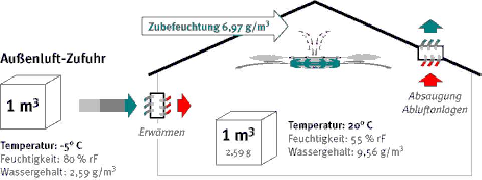 Um eine gewünschte Raumluftfeuchte von 55 % rF bei 20° C zu erhalten, muss jeder m³ Frischluft der zugeführt wird mit 6,97 g Wasser angereichert werden, um den erforderlichen Wassergehalt von 9,56 g/m³ zu erreichen. |