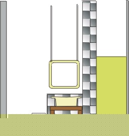 Ansicht Dusche, Waschbecken und Technikblock von rechts nach links: Dusche (vorne feststehende Glasscheibe 2.50-3.00 Meter hoch Technikblock mit Lüftungsführung und Zuleitung zu Solarkollektoren Technikblock unter Spiegel mit Wasserzufuhr, Abwasser Vor Technikblock steht das Waschbecken links am Technikblock ist die Toilette angebracht Sitzhöhe Toilette: 50 cm (Oberkante Sitzfläche)