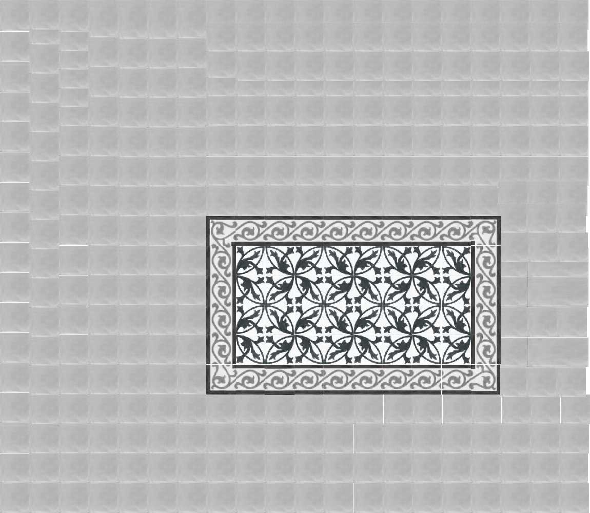 Um eine Vorstellung zu bekommen, wie ein derartiger Boden in unserem Bad wirken wird, haben wir einmal einen möglichen Verlegeplan erstellt. Die helle Fläche ist der Technikblock (eingefliest). |