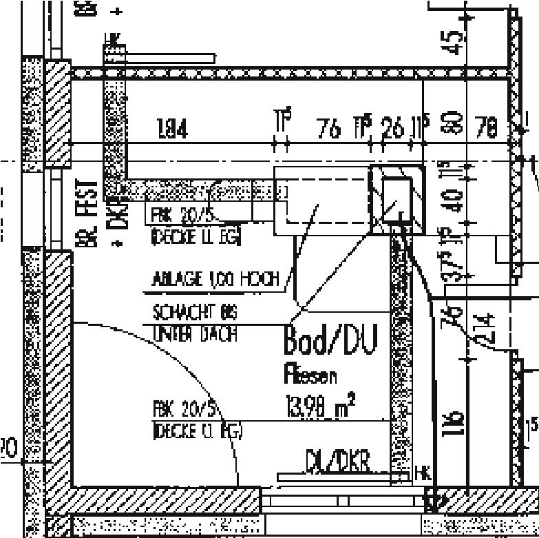 Detail Bad Dachgeschoss mit zentralem Technikblock in dem Wasser, Abwasser, Strom und Lüftung zusammen und konzentriert nach unten geführt wird. Eingezeichnet: Das Lehrrohr für die Gleichstromleitungen für die Photovoltarikanlage, im Technikschacht verlaufen die Wasserleitungen zum Sonnenkollektor bis auf das Dach.