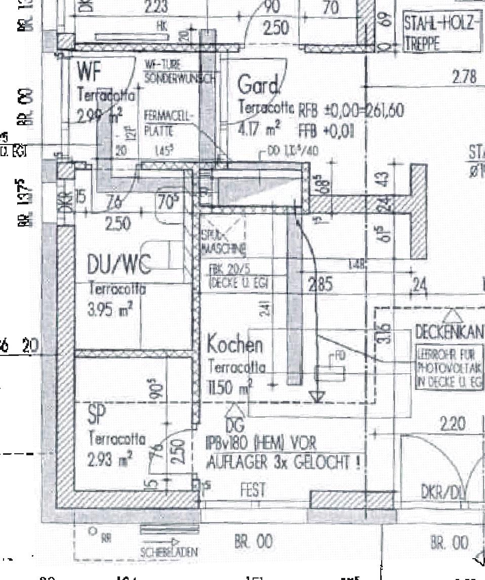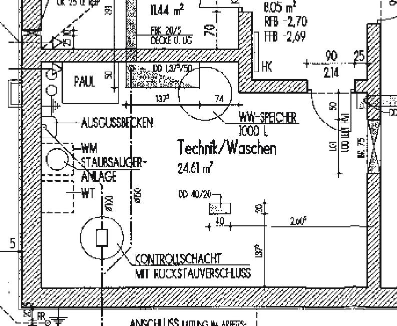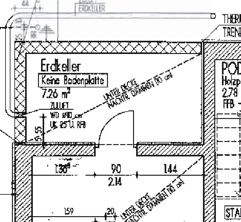 Detail Erdkeller, Vorratskeller, separater Erdwärmetauscher für Erdkeller. Die Lüftung der festerlosen Kellerräume erfolgt über Lüftungsanlage ohne WRG. Die restlichen Räume des Untergeschosses (innerhalb der thermischen Hülle) werden durch die Lüftungsanlage Paul Thermos mit WRG belüftet. |