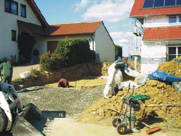 Die Streifenfundamente für die Fertiggarage werden ausgehoben (80 cm tief, 40 cm breit), der Weg zum Haus wird abgerüttelt (provisorisch). |