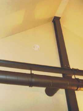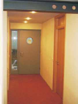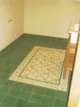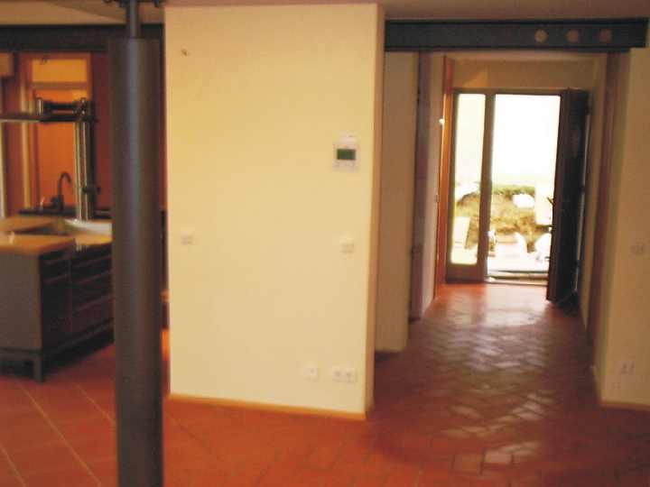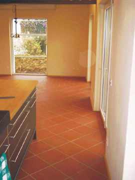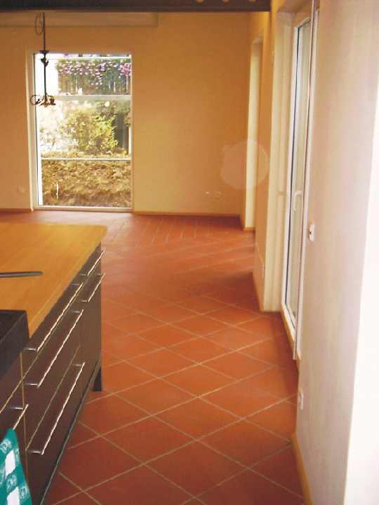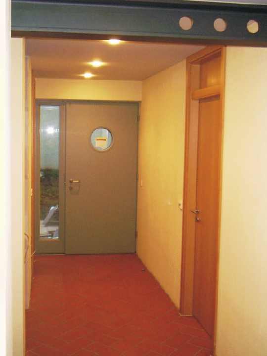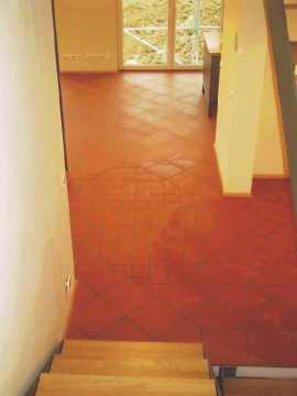 Links die Küche, rechts der Eingangsbereich, dazwischen moderne Technik. Zentral der Moeller EIB-Homeserver. Das gesamte Erdgeschoss ist mit rotem italienischen Cotto ausgelegt. Abwechslung bringt nur Format und Verlegemuster. |
