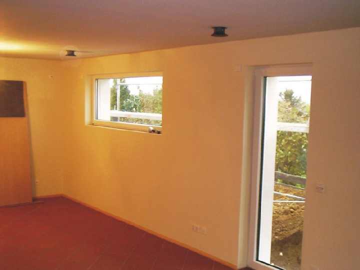 Blick vom Wohnzimmer ins Esszimmer, Ostseite. Links eine Terrassentüre in den Nutzgarten. Alle tragenden Wände sind mit Rotkalk verputzt. |