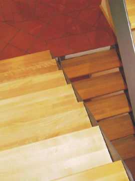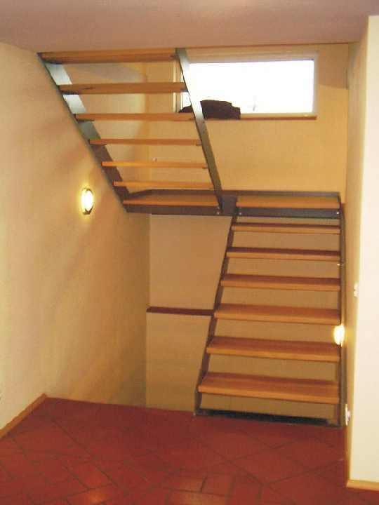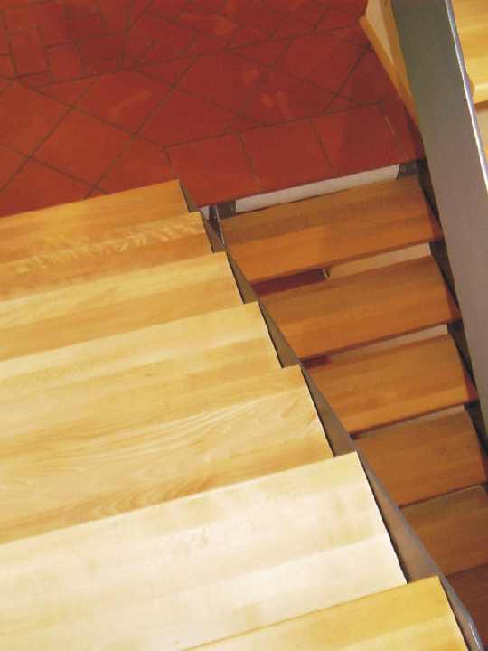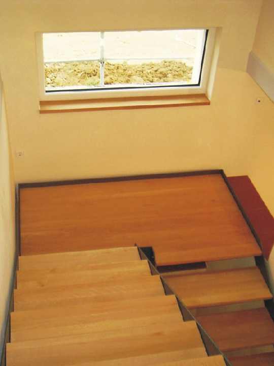 Der Aufgang ins Obergeschoss über eine Treppe mit pulverbeschichteten Stahlwangen und breiten Buchentritten, gefertigt von Fa. Brenner |