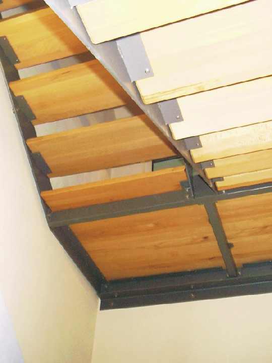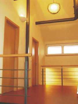 Blick von der Terrassentüre (mittleres Doppelfenster Südseite) auf die Galerie. Die Kanten der Betondecken sind betont hervorgehoben. Die gesamte Konstruktion bleibt sichtbar. |