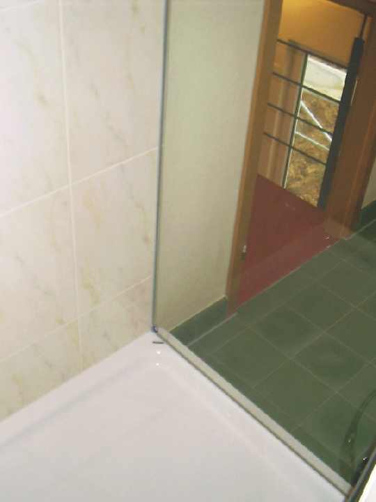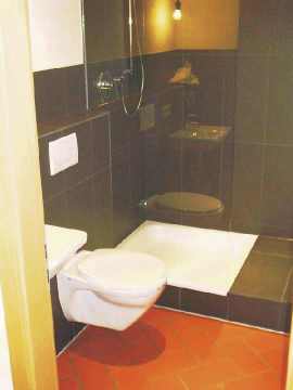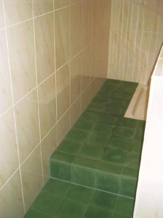 Zugang zur großen Dusche, die eine Badewanne vorerst überflüssig macht. |