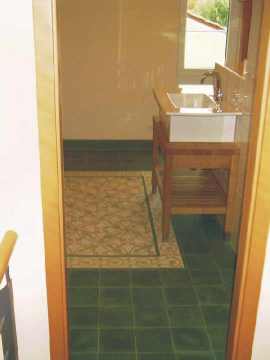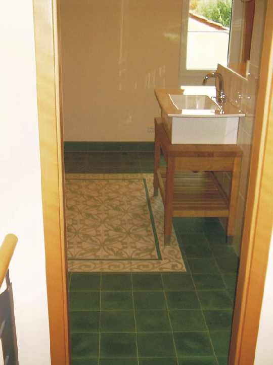 Blick ins Bad (OG). Via Zementfliesen am Boden, ein Nagano Waschtisch mit einem Unterschrank aus Eiche, gefertigt von Herrn Danner. |