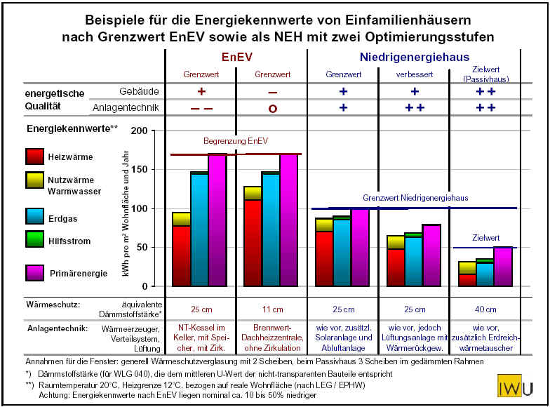 Das obige Bild zeigt den Grenz- und Zielwert des Niedrigenergiehaus-Standards im Vergleich mit den Anforderungen der EnEV. Die beiden links im Bild dargestellten Varianten entsprechen den Berechnungsbeispielen für die Einhaltung der EnEV-Grenzwerte: Ein guter Wärmeschutz wird mit einer energetisch ineffizienten Anlage kombiniert, ein schlechter Wärmeschutz mit effizienter Technik. Die drei rechten Varianten sind identisch mit den Optimierungsstufen 2, 3 und 4 für den Niedrigenergiehaus (bzw. Passivhaus-) Standard des Beispielgebäudes. Bei Einhaltung des Niedrigenergiehaus-Grenzwertes liegt der Primärenergiebedarf um über 40 %, bei Erreichen des Zielwertes