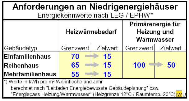 Der Grenzwerte für den Heizwärmebedarf von Niedrigenergiehäusern liegt für Einfamilienhäuser bei 70, für Reihenhäuser bei 65 und für Mehrfamilienhäuser bei 55 kWh pro m² beheizte Wohnfläche [Feist 1989] [Feist 1997] [EPHW 1997] [IPH].2 Langfristig ist aus Sicht von Klimaschutz und Ressourcenschonung im Neubau der Passivhaus-Standard einzig vertretbar. Daher stellt ein Heizwärmebedarf von 15 kWh pro m² den Zielwert für die energetische Optimierung von Niedrigenergiehäusern dar. Schon im Energiepass Heizung / Warmwasser [EPHW 1997] wird eine Begrenzung des Primärenergieaufwands für Heizung und Warmwasserbereitung eingeführt – sie entspricht einer Anlagenaufwandszahl von 1,33. Daraus lässt sich ein max. Primärenergiebedarf für Niedrigenergiehäuser von 100 kWh für Heizung und Warmwasser pro m² Wohnfläche ableiten. Die einheitliche Anforderung an Wohngebäude unabhängig von deren Größe oder Kompaktheit stellt eine gewisse Form von Gleichberechtigung her, da im Grunde nicht zu rechtfertigen ist, dass bestimmte Gebäudegruppen bei gleicher funktionaler Anforderung (Wohnen) einen höheren Energieverbrauch zugestanden bekommen. Dieser Grundsatz wurde bisher in Deutschland erstmals beim Passivhaus-Standard realisiert, inzwischen auch beim Förderprogramm der Kreditanstalt für Wiederaufbau „KfW-Energiesparhaus". Als Zielwert für den Primärenergiebedarf sollten 50 kWh pro m² Wohnfläche anvisiert werden. Dieser Standard entspricht etwa dem Standard des „KfW-Energiesparhaus 40" bzw. dem Passivhaus mit effizienter Anlagentechnik nach [PHPP].