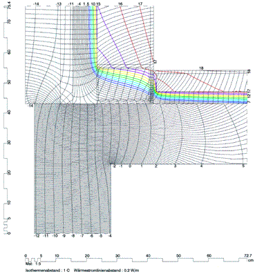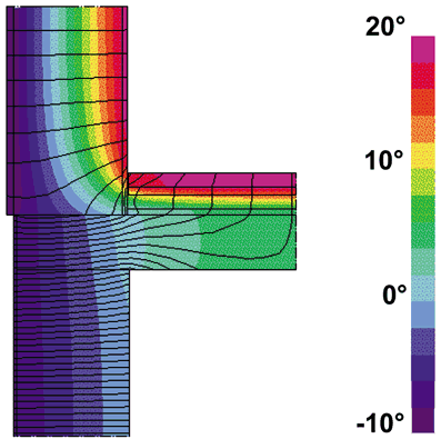Deutlich ist im rechten oberen Bild zu erkennen, daß der ungedämmte Betonboden die Raumwärme ungehindert an das Erdreich abgibt während die besser gedämmte Wand aus Gasbeton an der Außenseite fast kühl beibt. Die zugehörigen Isothermen zeigt das Bild unten rechts. Die Isothermen können auch wie im nachfolgenden Bild farblich dargestellt werden.