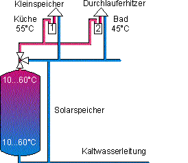 Zur Nacherwärmung können konventionelle Öl-, oder Gasheizungsanlagen dienen, die auf einen Wärmeaustauscher im oberen Bereich des Solarspeichers arbeiten. Ist die Mindesttemperatur am Auslauf des Solarspeichers unterschritten, wird die Heizung aktiviert und erwärmt den Inhalt im oberen Speicherbereich. Sinnvoll ist die Verlegung der Nacherwärmung außerhalb des Solarspeichers. Zum Einsatz kommen hierbei elektronische Durchlauferhitzer, die speziell für die solare Nacherwärmung geeignet sind, sowie geschlossene Warmwasserspeicher. Es wird dann nur die tatsächlich benötigte Wassermenge nacherwärmt. Durch die dezentrale Platzierung der Geräte nahe der Zapfstellen werden die Leitungsverluste gering gehalten. Die dezentrale Nacherwärmung bei Bedarf führt zu einer höheren Ausnutzung der Sonnenenergie, da das gesamte Speichervolumen für die Solarwärmespeicherung ausgenutzt wird und kein konventionell vorgewärmtes Wasser vorgehalten wird, das die Wärmeabgabe des Kollektors beeinträchtigt.