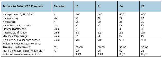 Zuverlässig gesteuert Der integrierte Mikroprozessor des VED E classic ermittelt und steuert anhand der Wassereinlauftemperaturund der per Flügelradsensor erfassten Wassermenge die erforderliche Temperaturleistung des Gerätes auf der Basis der gewählten Temperatureinstellung. Die Temperatur lässt sich per Drehschalter leicht auf einen Wert stufenlos zwischen 30 und 60 °C einstellen. Der Temperaturbereich entspricht einer Skala von 1 bis 7 am Gerät. VED-E 21/5 €550,- (Netto)