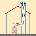 Der Brenner ist in den Kreis der Raumlüftung eingekoppelt. Er entnimmt seine Zuluft der Abluft des Raums. Die Abgase werden unvermischt, parallel zur Abluft, abgeleitet. Die Abgaskanäle sind ergänzend entweder mit Abgas oder mit Abluft gefüllt. Alle drei Medien (Zuluft, Abgas, Abluft) stehen in thermischem Kontakt. Die Abgase kommen, je nach Rücklauftemperatur, mehr oder weniger ankondensiert aus dem Kessel und kondensieren im Kamin weiter, bis fast auf Aussentemperatur. Die «Kühlleistung der Zuluft » und die Restwärme der Heizung schwingen synchron und ergänzen sich ideal. Die Kondensationsenergie wird unten im Kamin eingetragen und geht damit überwiegend an die Zuluft (hohe treibende Temperaturdifferenz). Abluft und Abgas werden vom gleichen Ventilator angetrieben. Die Verbrennung profitiert durch eine fast totale Abgaskondensation (Kühlung der Abgase bis fast auf Aussentemperatur), und zwar unabhängig von der Rücklauftemperatur der Heizung, dem Wegfall der Bereitschaftsverluste aller wärmetechnischen Geräte.