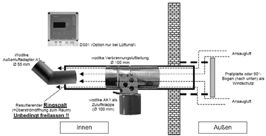 | Verbrennungsluft-Zuführung für Festbrennstoff- Feuerstätten mit Luft-Abgas-Systemen Wohnraum-Feuerstätten für Festbrennstoffe wie Kamin–, Kachelöfen o.ä. bedürfen bei der heute geforderten dichten Bauweise einer separaten Verbrennungsluftzuführung. In den Bauten der Wärmeschutzverordnung 95 war dies nur in Ausnahmefällen, z.B. bei im Raumverbund stehenden Wohnraum- Feuerstätten mit Dunstabzugshauben oder offene Kaminanlagen nach Bauart A2, der Fall. Alle anderen Aufstellvarianten von Kamin– und Kachelöfen konnten ihre nötige Verbrennungsluft aus dem Aufstellraum ziehen. Auf Grund der bis zu diesem Zeitpunkt noch relativ undichten Bauweise war ein natürlicher und unkontrollierter Luftaustausch und somit eine ausreichende Sauerstoffzufuhr über undichte Fenster und Türen sowie sonstige ungewollte Öffnungen in der Gebäudehülle gegeben. Mit der Umsetzung der EnEV und der damit verbundenen Gebäudedichtheit ist ein einwandfreier Betrieb dieser Wohnraumfeuerstätten nicht mehr ohne weiteres möglich. Des Weiteren ist eine gesundheitliche Gefährdung des Betreibers möglich, da der erforderliche Mindestdruck im Gebäude von 4 Pascal, bei Betrieb einer Feuerstätte ohne separate Verbrennungsluftzufuhr von Außen, unterschritten würde. Dies kann eine Beeinträchtigung der Rauchgasabführung verursachen, was sich auf die Betriebweise des Gerätes auswirkt. |