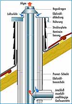 dass kein unzulässig hoher Unterdruck entsteht. Eine weitere Möglichkeit ist es, die Festbrennstoff-Feuerstätte (Kamin- oder Kachelofen etc.) mit einem Luft-Abgas-Schornstein zu betreiben. Er ermöglicht den raumluftunabhängigen Betrieb, indem er die notwendige Verbrennungsluft über einen eigenen, an den Mantelstein angeformten Lüftungszug zur Verfügung stellt. Dabei ist eine Konstellation aus Festbrennstoffzug, Lüftungszug und Zentralheizungszug (zum Anschluss einer raumluftabhängig oder raumluftunabhängig arbeitenden Heizungsanlage) sinnvoll. |