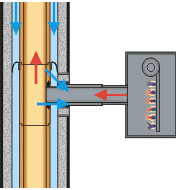 Lösungsansatz Wienerberger Über den Schornsteinschacht wird Verbrennungsluft der Feuerstätte konzentrisch zugeführt.1 Vorteile: Ein schlanker Schornstein und eine unkomplizierte Konstruktion. 1 Durch Teilwärmedämmung wird bei der konzentrischen Lösung ein thermischer Auftrieb der Zuluft vermieden. |