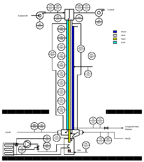 Dazu wird die Aussenluft unter den Gefrierpunkt abgekühlt und über ein Schauglas kann die Vereisung im Abluftkanal verfolgt werden. Mit den Messungen sollen Aussagen zur Rückwärmzahl, zur rückgewonnenen Energie und Leistungsaufnahme des Kanalsystems und Praxistauglichkeit gemacht werden. Um diese Daten zu generieren werden alle Zustandsgrössen der Luft und des Wasserregisters mit einem Datenlogger aufgezeichnet. Die Temperaturen werden mit kalibrierten PT100 Fühlern erfasst, und wo nötig von mehreren Fühlern Mittelwerte gebildet. Durch die 10 Oberflächentemperaturen auf dem Tauscher kann der Temperaturverlauf über die Länge dargestellt werden. Eine Verfälschung der Resultate durch die Umgebung wird mit einer 50 mm dicken Isolation verhindert. Dieser Messaufbau dient im Allgemeinen dazu, gesicherte Daten zum Betrieb des Luftkanalwärmetauschers zu ermitteln. Das Handling wird an einem Objekt geprobt und Schwächen im Konzept können bei folgenden Versionen verbessert werden. Mit den Erfahrungen können Regelstrategieen optimiert und somit der Nutzen für die Kunden gesteigert werden. Die Messungen sind bis September 2002 abgeschlossen.