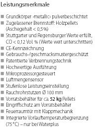 Thermostatische Regelung Zündung und Regelung mit Fernbedienung Wärmeleistung über 5 Stufen regelbar Geringer Ascheanfall (<0,5%) Raumluftunabhängig Heizleistung ca. 2,5 - 7 kW