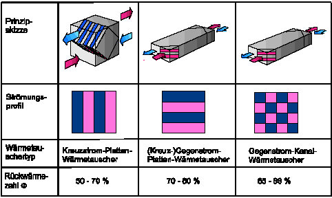 Das „Herzstück" des Wärmerückgewinners ist der Wärmetauscher. Seine Bauart ist maßgebend für die Effizienz der Wärmerückgewinnung. Folgende Wärmetauscher-Typen werden vorwiegend angeboten: