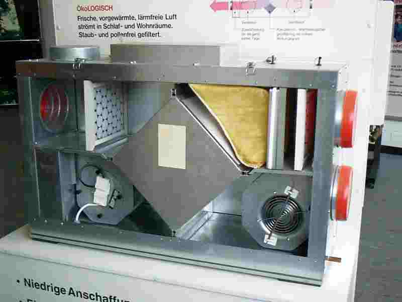 Um die hygienischen Anforderungen an die Raumluftqualität dennoch einzuhalten, muss der Raum manuell oder mechanisch "kontrolliert" belüftet werden. Vom Standard eines Niedrigenergiegebäudes an wird für das energetische Konzept eine kontrollierte Wohnungslüftung mit einer Wärmerückgewinnung aus der Abluft notwendig. Das nachfolgende Bild zeigt das Schema einer mechanischen Zu- und Abluftanlage mit Wärmerückgewinnung, wie sie für Niedrigstenergie- und Passivhäuser erforderlich ist.