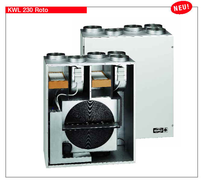 | Kommentar Bauweise.net: Informationen zum Helios Roto 230 sind derzeit noch spärlich zu bekommen. Der Rotor besteht aus Aluminium und scheint nicht beschichtet zu sein, daher wahrscheinlich keine quantitative Feuchterückgewinnung möglich. Freundlicherweise hat uns die Marketingabteilung von Helios bearbeitbareres Bildmaterial zur Verfügung gestellt. Herzlichen Dank. Trotzdem enthält dieses keine Angaben zur Feuchterückgewinnung. Auf Seite 8 kann gelesen werden, Zitat []: Ideale Raumluftfeuchte das ganze Jahr. Raumbefeuchter gehören der Vergangengheit an...Zitat Ende, allerdings werden keinerlei Messwerte angegeben, wie viel Feuchte tatsächlich "zurückgewonnen wird - im Gegensatz zu Anbietern, die mit Feuchterückgewinnung werben. Der Wirkungsgrad liegt zudem nicht wie bei Enthalpiegeräten über 100%. Trotzdem ist das Gerät besser als Geräte mit einfachem Gegenstrom- oder Kreuzstromwärmetauscher, da auf einen Erdwärmetauscher oder eine sinnlose Vorheizung zur Enteisung verzichtet werden kann. | ||