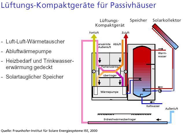 Erfolgversprechend ist vor allem eine solche Variante, bei der die Erschließungskosten einer Wärmequelle (Erdsonde, Erdabsorber) für die Wärmepumpe entfallen. Dies gelingt bei Einsatz einer Abluftwärmepumpe, die die Restenergie der Abluft nach der passiven Wärmerückgewinnung nutzt. Wird ein Erdreichwärmeüberträger im Winter zum Vorwärmen der Frischluft eingesetzt, so reicht beim Baustandard des Passivhauses die sensible und latente (Kondensationsenergie der Luftfeuchte) Wärme der Abluft aus, um zusammen mit der elektrischen Antriebsenergie der Wärmepumpe den größten Teil des Restwärmebedarfs zu decken. Die Gebäude in Büchenau und Neuenburg demonstrieren den Einsatz dieser Technologie. Wird der Wärmeschutzstandard eines Passivhauses nicht erreicht, muß eine Zusatzwärmequelle für die Wärmepumpe herangezogen werden. Das Fraunhofer ISE arbeitet seit einiger Zeit an der Untersuchung entsprechender Versorgungskonzepte für Solar- Passivhäuser und hat dafür neue Simulationsmodelle entwickelt, ökonomische Studien angestellt und meßtechnische Untersuchungen durchgeführt, um die Industrie bei der Entwicklung von entsprechenden Geräten zu unterstützen. Mit finanzieller Unterstützung interessierter Industrieunternehmen entstand ein Teststand zur Untersuchung von "Lüftungs- Kompaktgeräten" auf dem bereits einige Geräte intensiv getestet werden konnten.