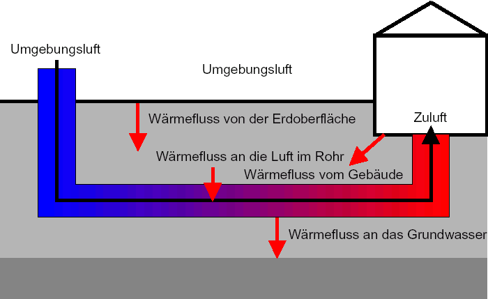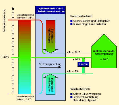 Die Temperaturdifferenz von Erdreich zu Außenluft, die im Winter bis zu 25 K betragen kann, lässt sich für die Erwärmung der Zuluft nutzen. Mit dem gleichen System lässt sich im Sommer die aufgeheizte Sommerluft kühlen, bevor sie in das Gebäude geleitet wird. Insbesondere für Büro- und Betriebsgebäude kann der Erdwärmetauscher konventionelle Heizungs-, Klima- und Lüftungstechnik-Systeme sinnvoll ergänzen oder im Passivhausbereich in Kombination mit einer Lüftungsanlage mit Wärmerückgewinnungsanlage auch komplett ersetzen.