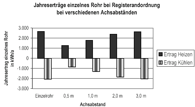 Jahreserträge eines einzelnen Rohres des Referenz-EWT bei Registeranordnung bei verschiedenen Achsabständen, Register bestehend aus 10 Rohren Quelle: 4. Symposium Versorgungstechnik Fachhochschule Offenburg, Fachbereich Maschinenbau, Studiengang Versorgungstechnik Dipl.-Ing.(FH) Markus Betz, Absolvent Versorgungstechnik im SS 1997, T.P.I. Trippe und Partner Ingenieurgesellschaft mbH