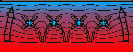 | Die Erdreichtemperatur an der Rohrwand hängt zunächst vom Wärmeaustausch zwischen dem tiefen Erdreich, den oberflächennahen Erdschichten und der Umgebungsluft ab. Sobald der EWT in Betrieb ist, beeinflusst der Wärmeaustausch zwischen Luft und Rohr im EWT ebenso die Erdreichtemperatur an der Rohrwand und in der Nähe des Rohres. Die ungestörte Erdreichtemperatur an der Rohrwand sei die Temperatur, die das Erdreich ohne EWT an einer beliebigen Stelle annehmen würde. Dies entspricht bei homogenem Erdreich der Temperatur, die das Erdreich in gleicher Tiefe aber weitab vom EWT einnimmt. | Beeinflussung des