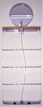 Aus dem Vorratsbehälter kann wie bei einer Flasche nur dann Wasser nachfließen wenn Luft eintreten kann. Bei unserem Poster wird die Luftzufuhr unterbrochen wenn in der unteren Wasserauffangwanne Wasser steht. |